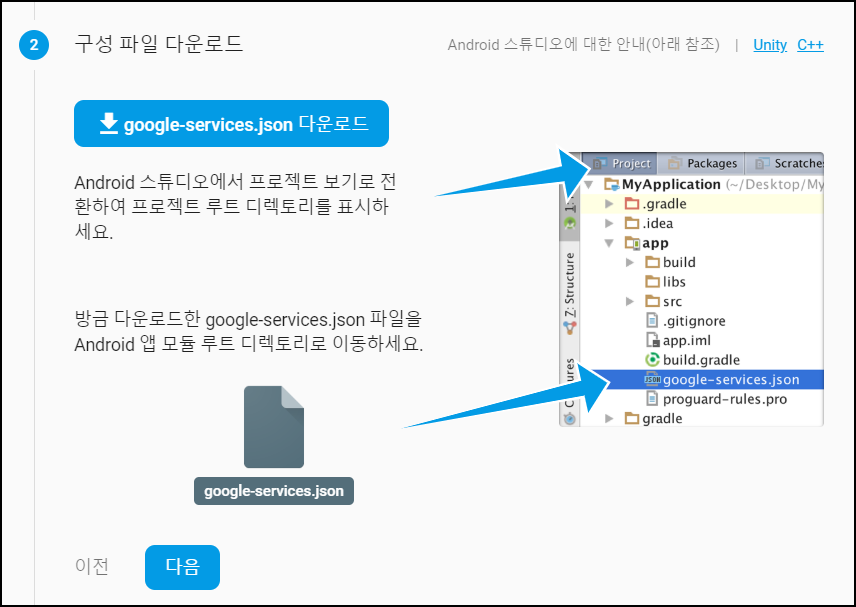 "google-services.json" 파일을 다운로드합니다.
