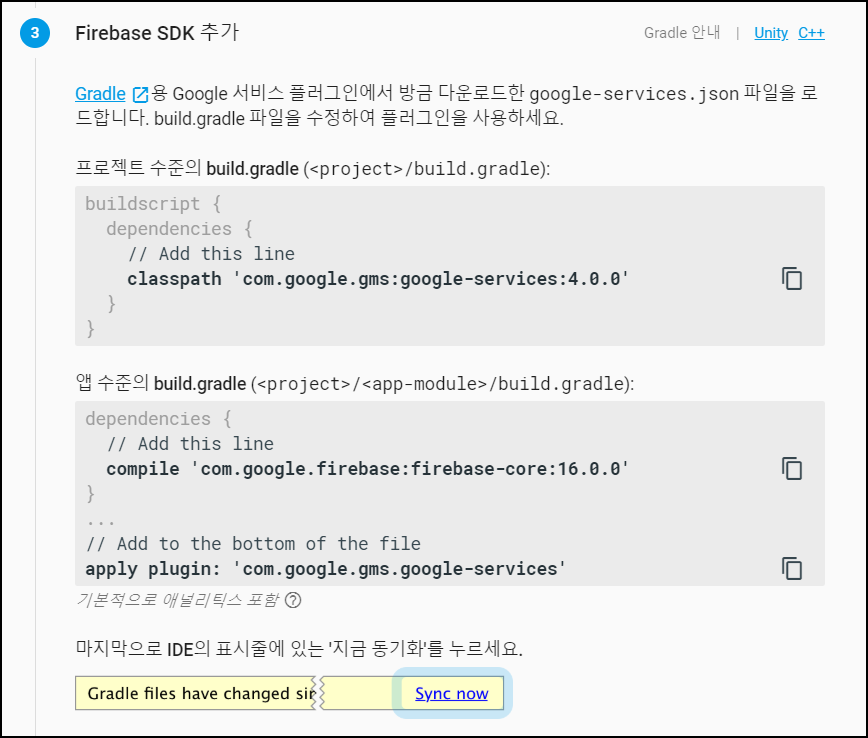 그리고 "지금 동기화(Sync now)"를 클릭하여 gradle 빌드를 완료하면