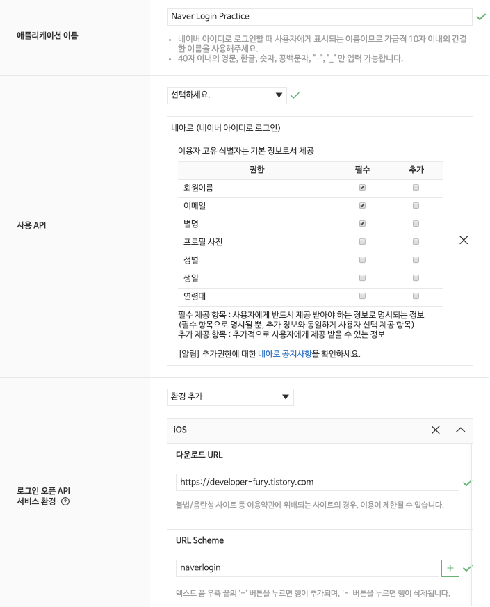 로그인 오픈 API 서비스 환경 : 개발 플랫폼을 추가하게 되며(우리의 경우 iOS), 다운로드 URL 및 URL Scheme을 작성함