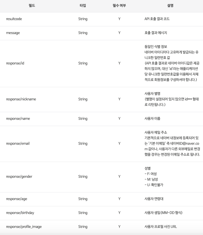 사용 API : 네아로(네이버 아이디로 로그인)를 통해서 필요한 정보를 가져옴