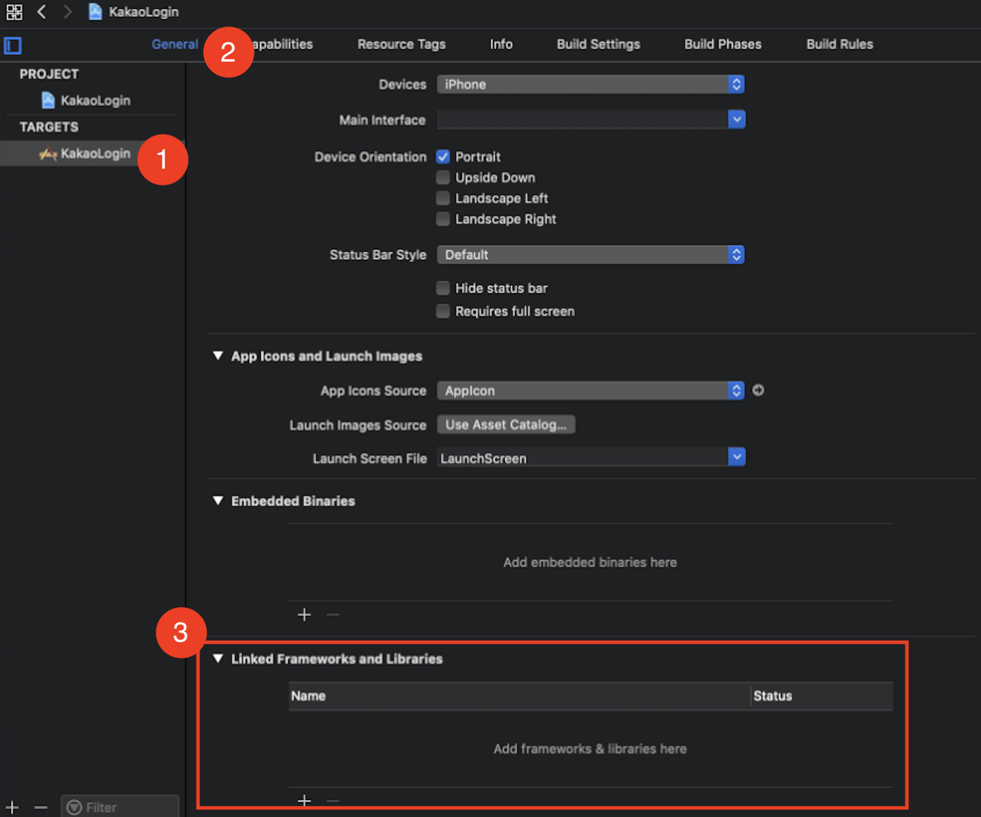 "Linked Frameworks and Libraries"에 +버튼을 눌러주세요.