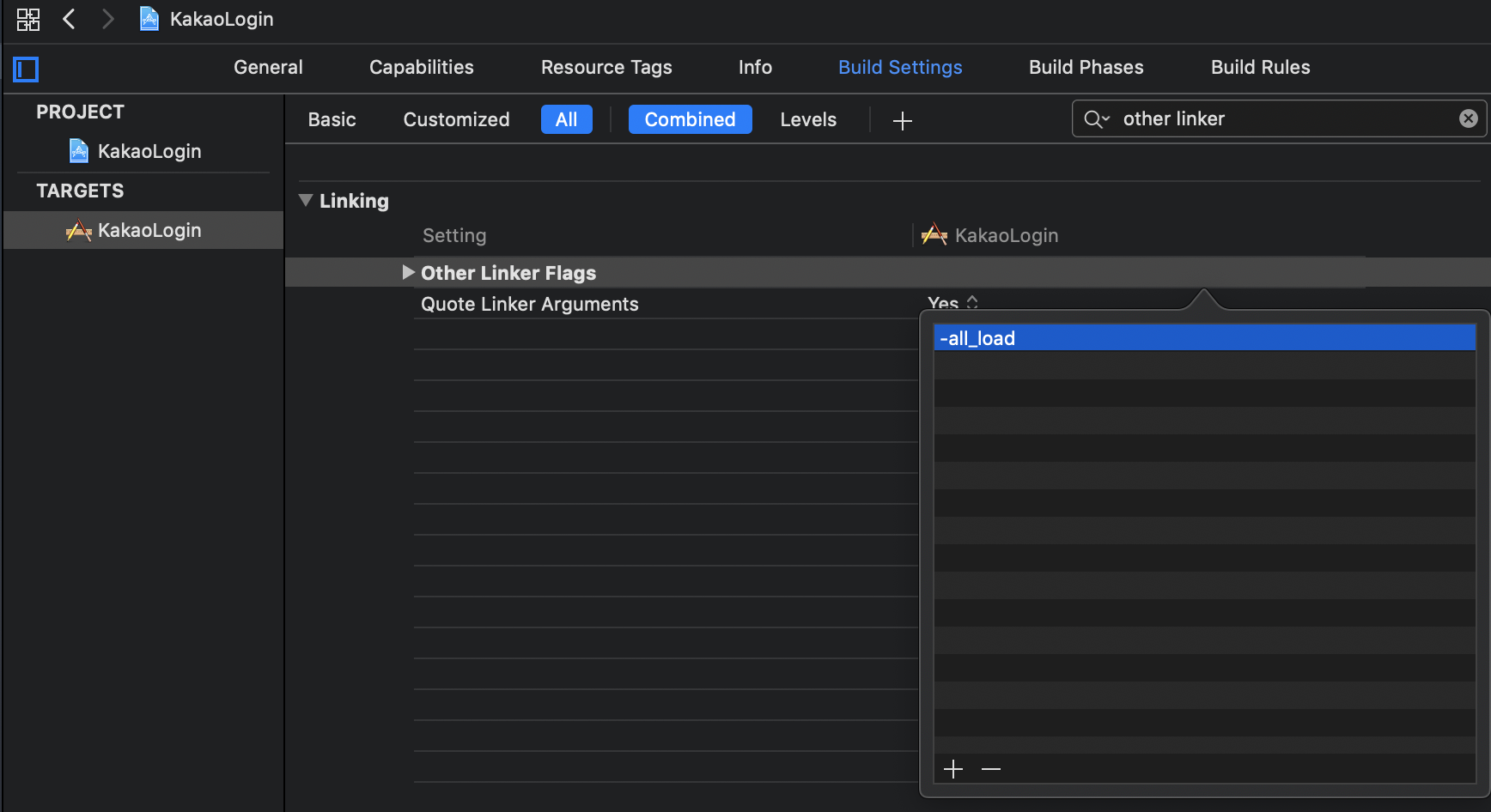 자 이제, Other Linker Flags에 "-all_load"를 추가할 거예요.
