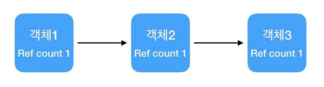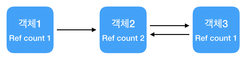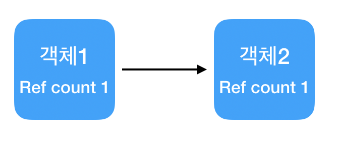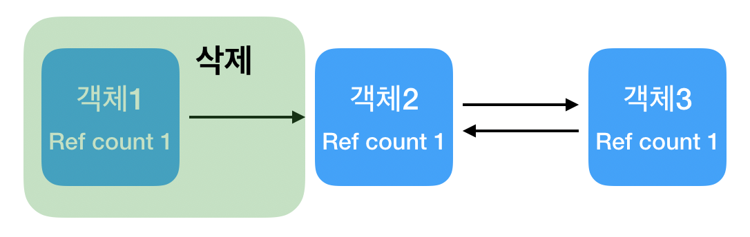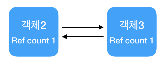 - 객체에 접근 가능한 모든 연결을 끊었음에도 순환 참조로 인해 활성화된 참조 카운트가 남아 있어 메모리 누수가 발생하는 현상