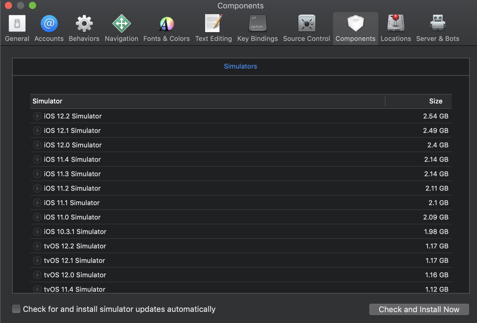 (시뮬레이터 리스트에 Download Simulators...가 없다면