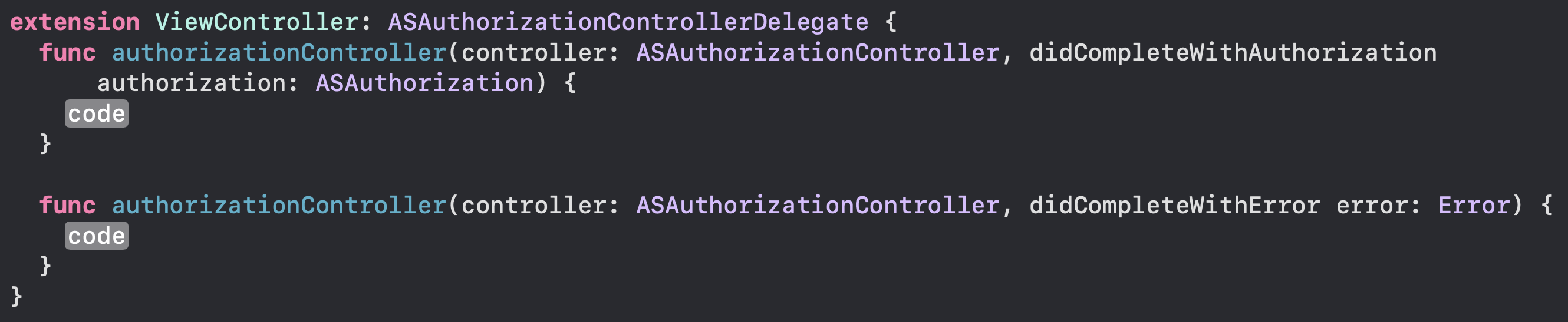 handleAuthorizationAppleIDButtonPress 메서드를 구현해 보겠습니다.