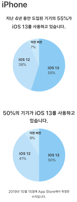 19년 10월 15일 기준 iOS 13 버전이 50% 이상이네요 ㅎㅎ