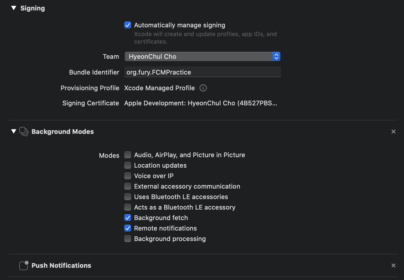 "Push Notifications"와 "Background Modes"를 추가해주세요.