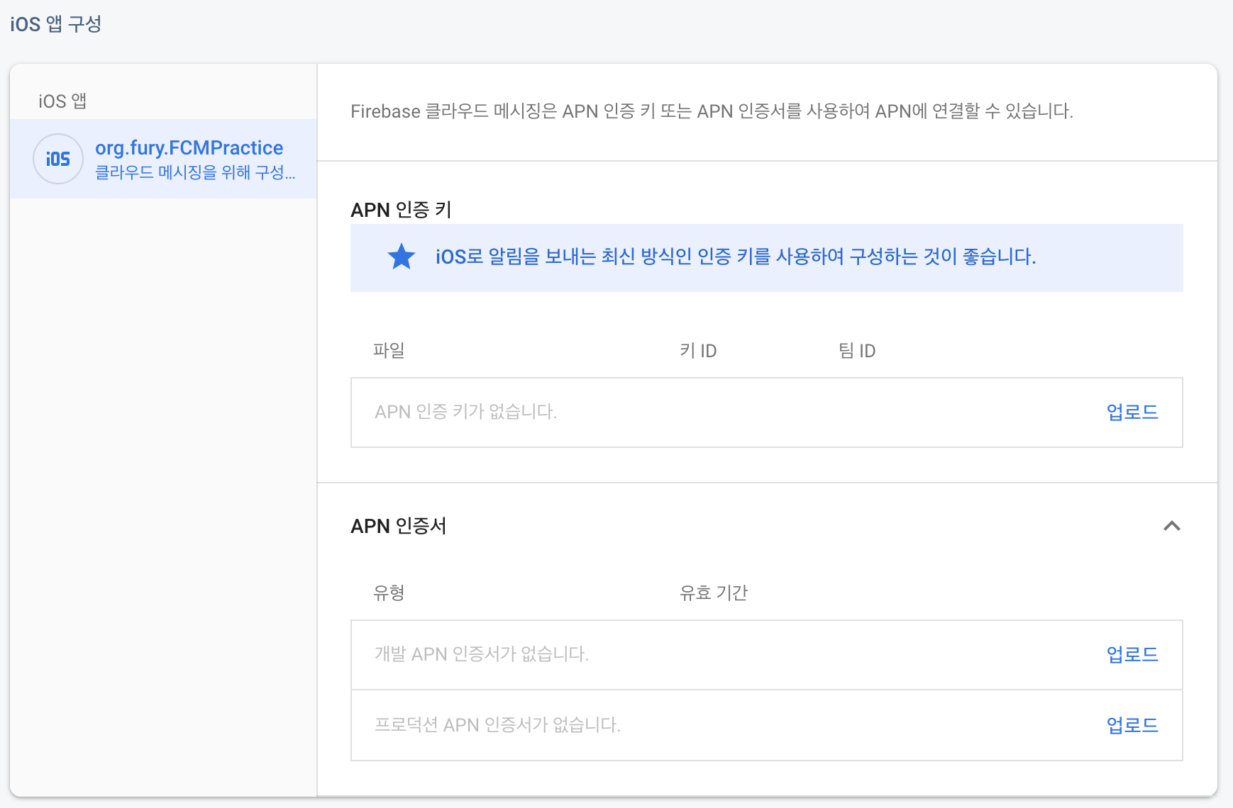 그러면 APN 인증 키를 업로드하는 화면이 있어요.