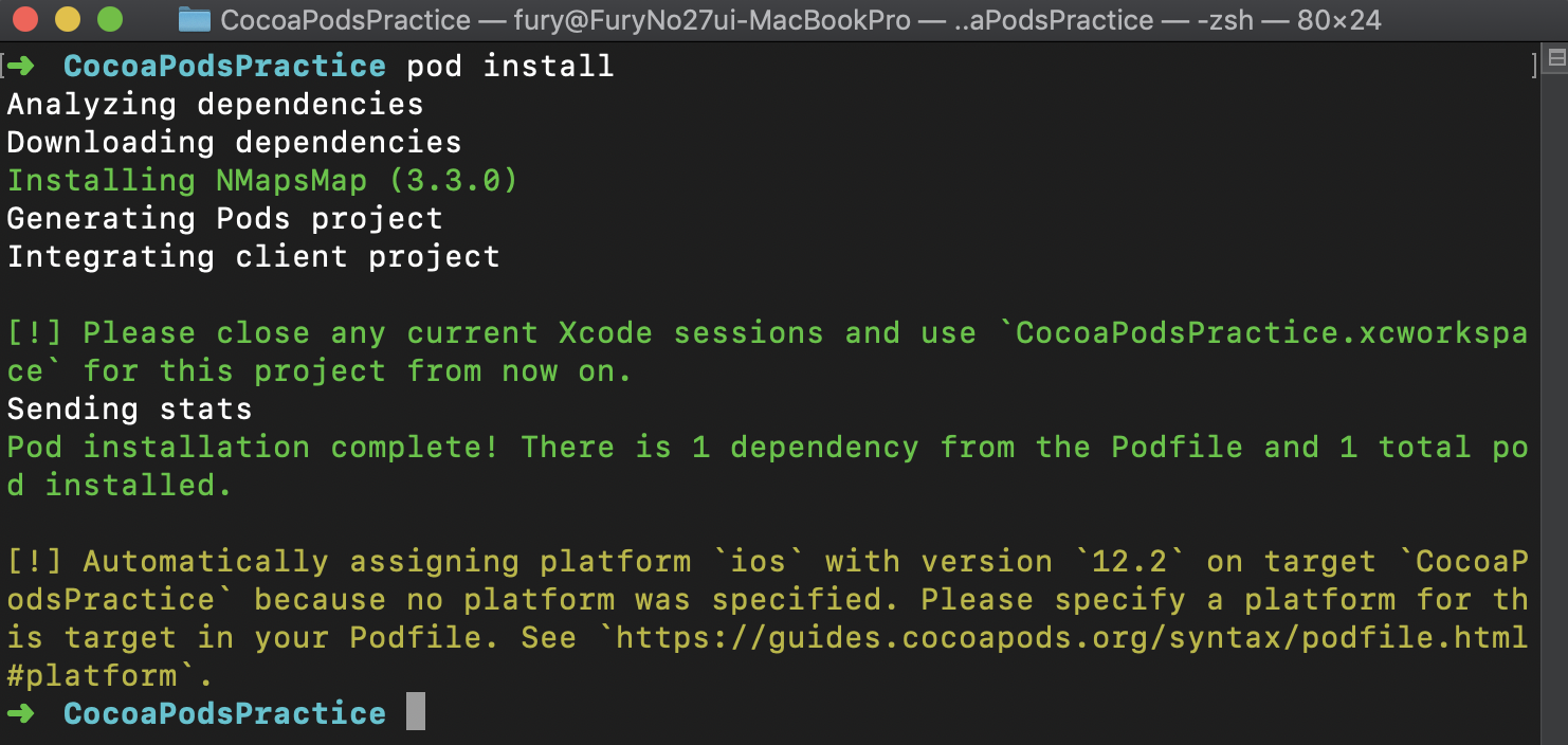 그러면 "Pod installation complete! There is 1 dependency from the Podfile and 1 total pod insttalled."라는 완료 문구를 볼 수 있습니다.