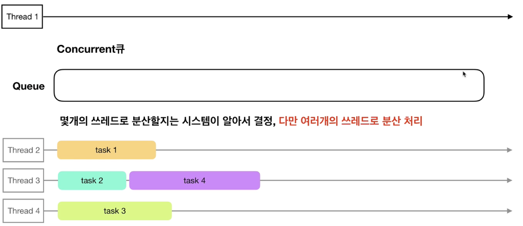 메인 쓰레드에서 하나의 동시큐에 작업들을 할당합니다.