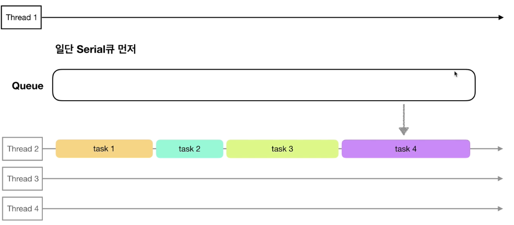 각각의 직렬(Serial)큐 별로 하나의 쓰레드에 작업을 할당하지만